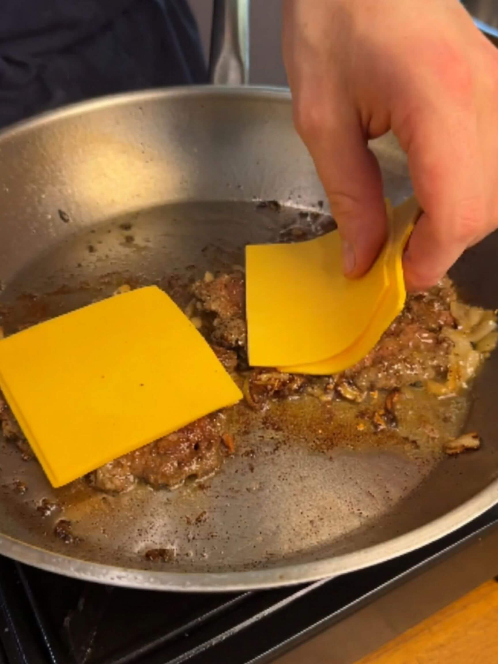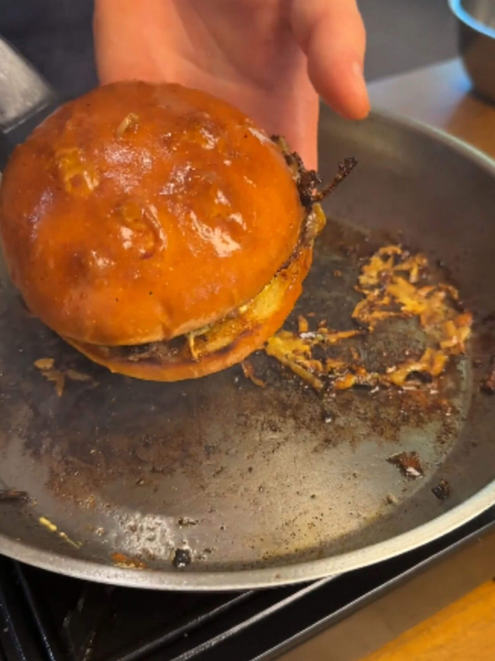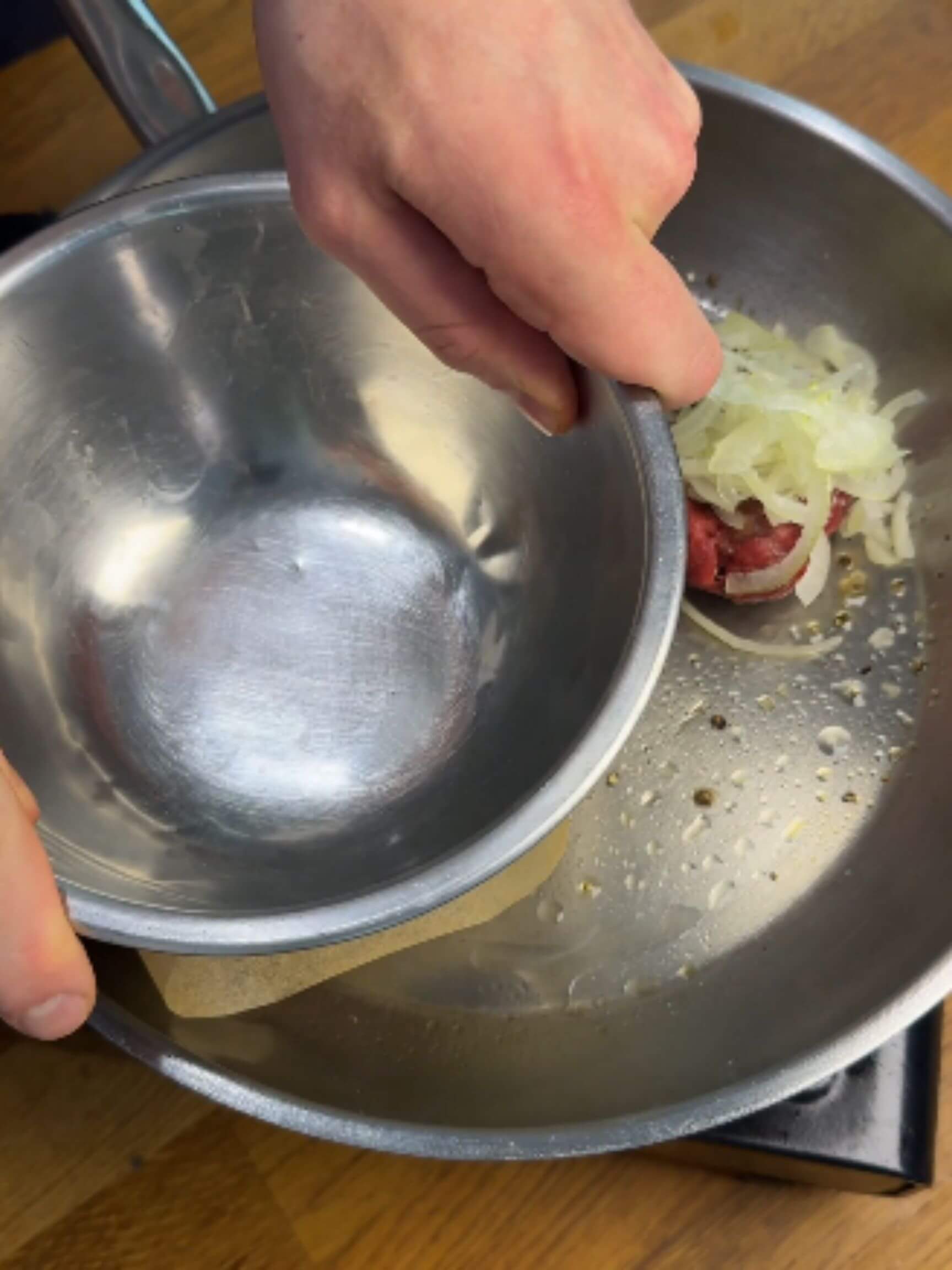 Na rozgrzaną patelnię kładziemy kulkę mięsa, a na nią porcję cebuli. Następnie całość mocno przygniatamy - najlepiej przy pomocy praski lub miski. Dzięki temu mięso maksymalnie przylega do powierzchni patelni i tworzy intensywnie przypieczoną, chrupiącą skórkę.
