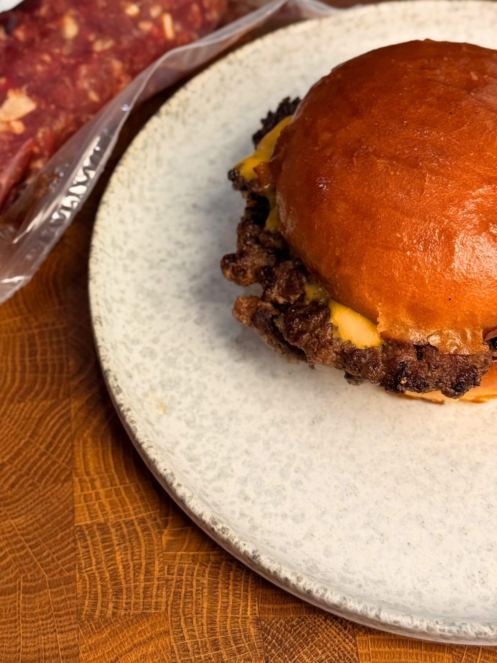 Podstawą tego burgera jest wysokiej jakości mielona wołowina 80/20. Odpowiednia proporcja mięsa do tłuszczu sprawia, że burger pozostaje soczysty, a jednocześnie pięknie się karmelizuje na patelni.
